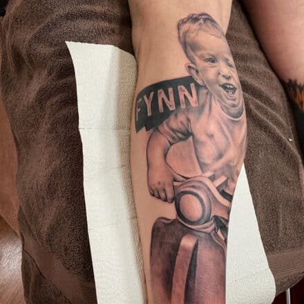 Tetování dítě symbol a kostlivec na lýtko