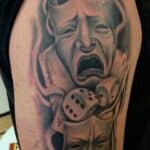 Tetování divadelní masky a hrací kostky na rameni