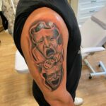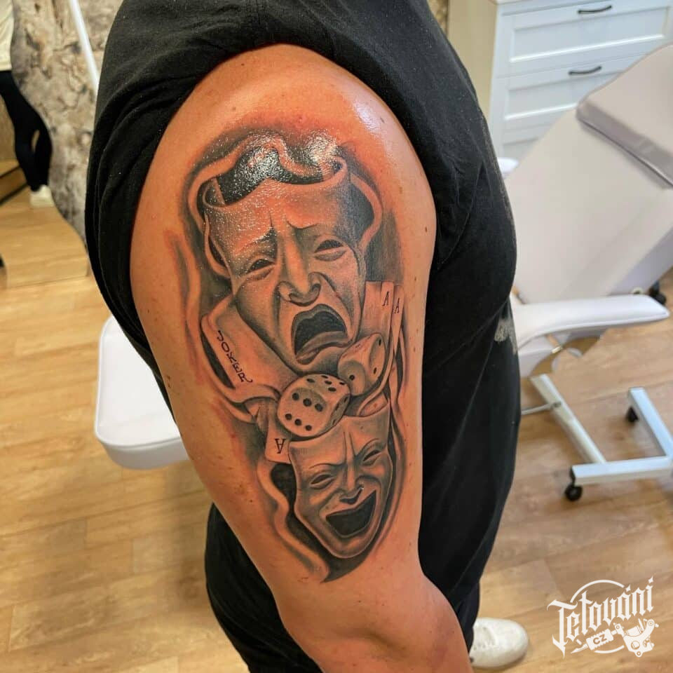 Tetování divadelní masky a hrací kostky na rameni