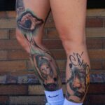 Tetování divadelní masky, loutka, postavička, portrét, nápisy na lýtka