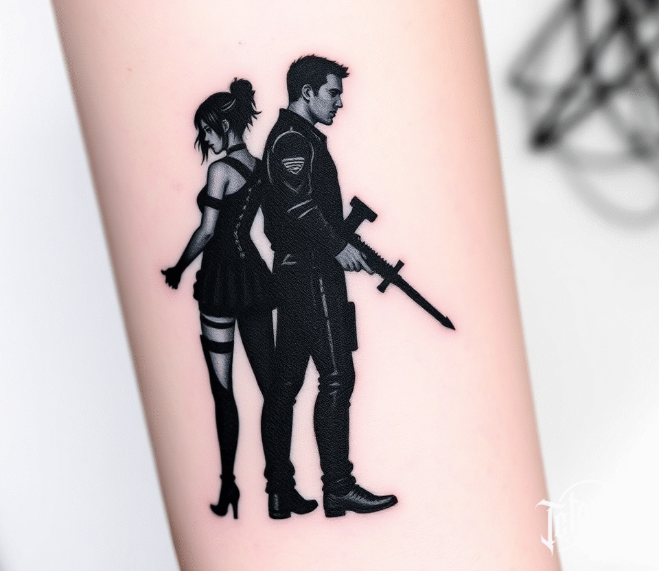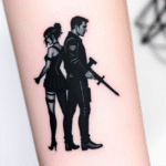 Tetování divergence z filmů a pohádek, muž a žena na předloktí