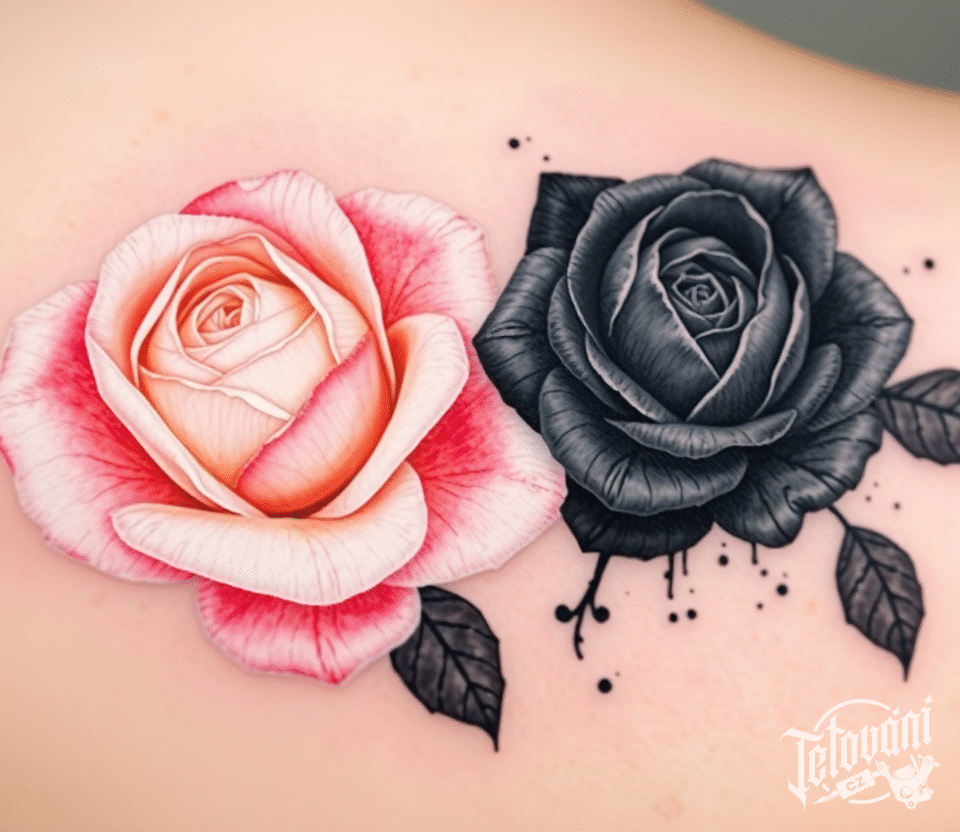 Tetování dobro a zlo, květiny, růže na lopatce