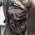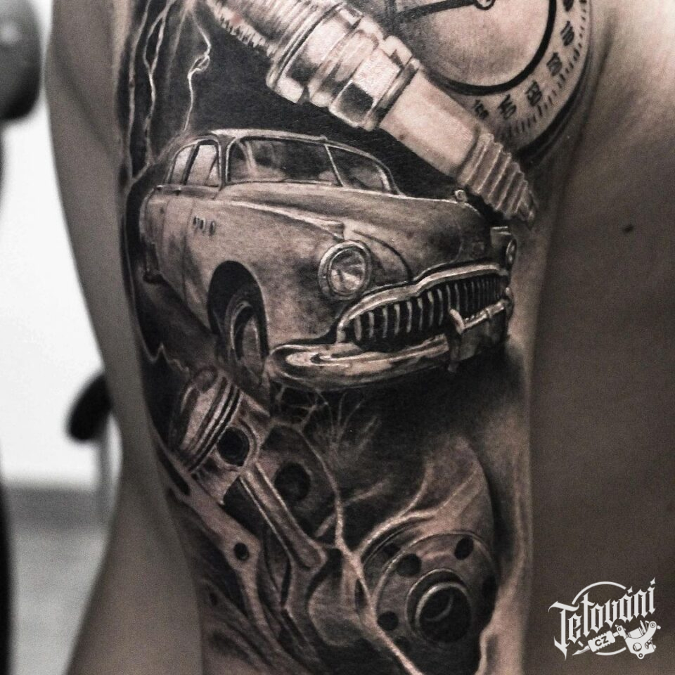 Tetování dopravní prostředek, auto, hodiny, symboly na rameno