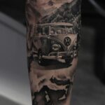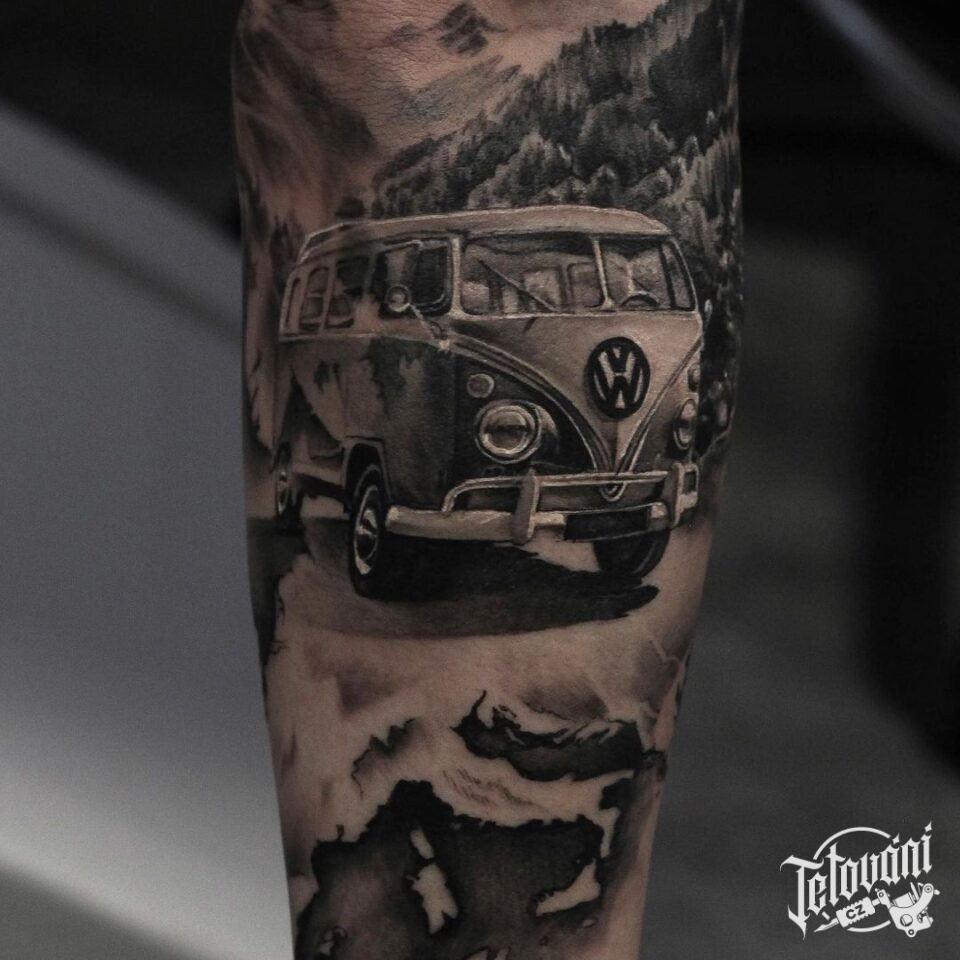 Tetování dopravní prostředek, auto, hory, les na předloktí