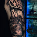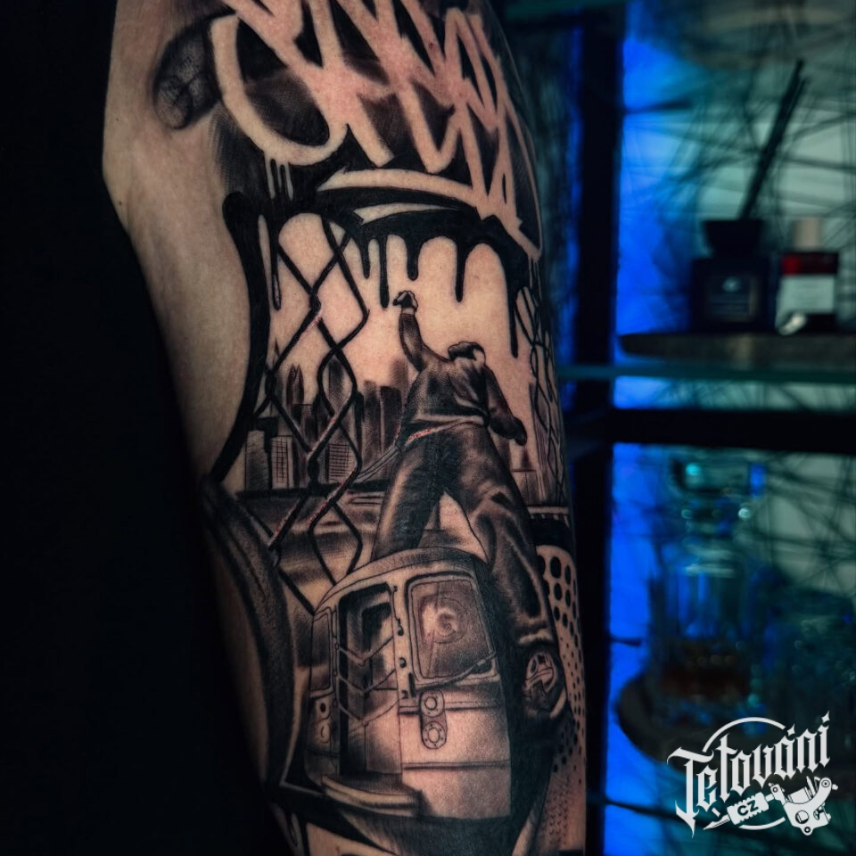 Tetování dopravní prostředek auto, muž a nápis na rameno