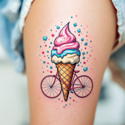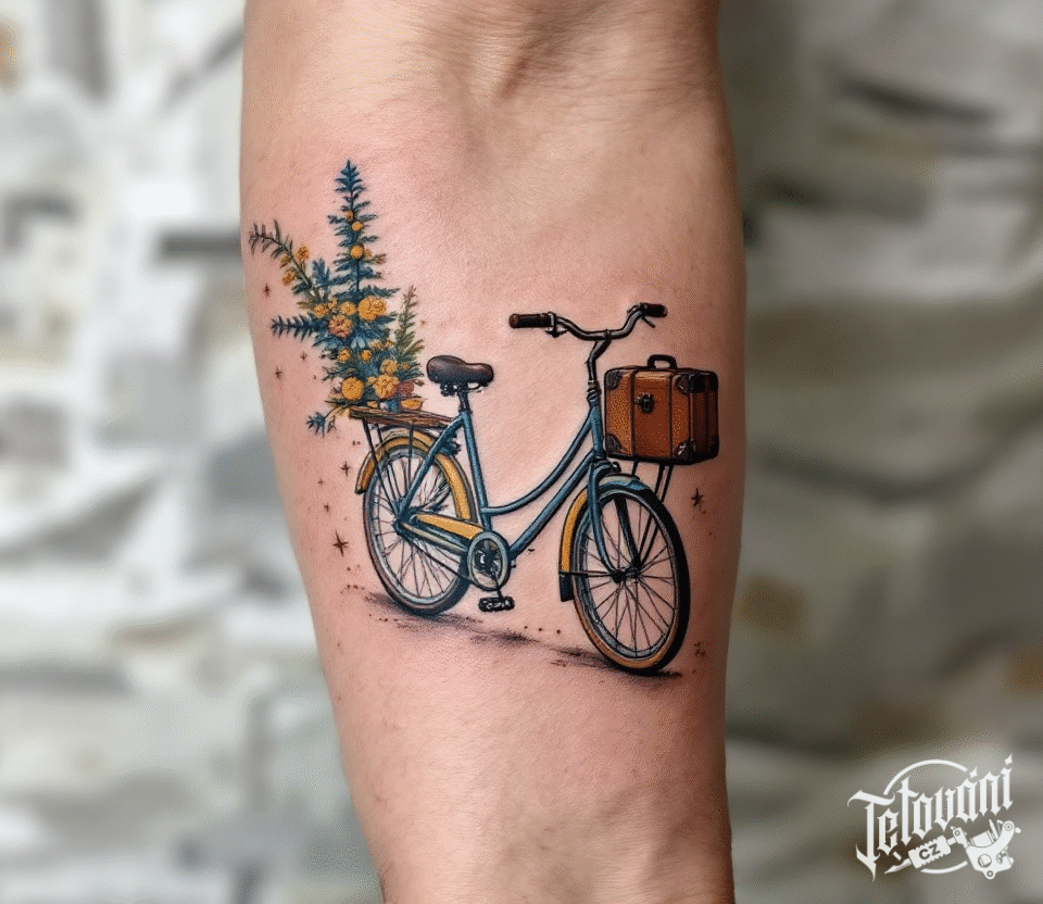 Tetování dopravní prostředek kolo a květiny na předloktí