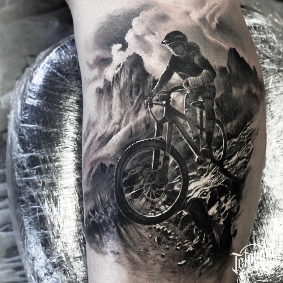 Tetování dopravní prostředek kolo, příroda, hory na lýtko
