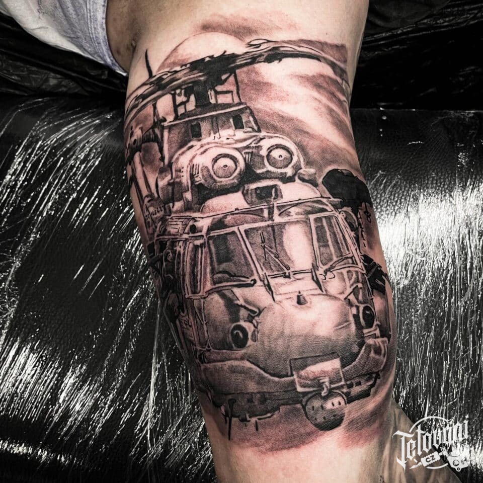 Tetování dopravní prostředek letadlo, symbol – vojenský vrtulník na paži