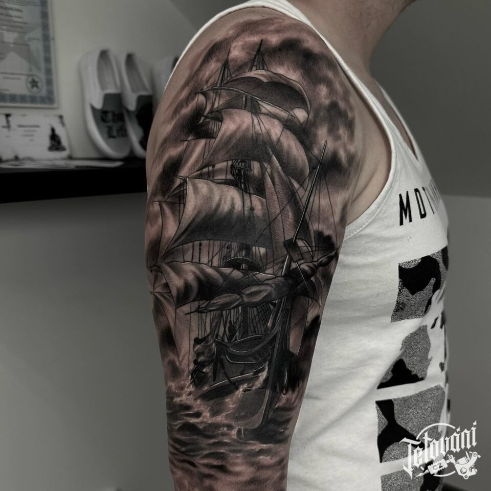 Tetování dopravní prostředek loď, moře na rameno