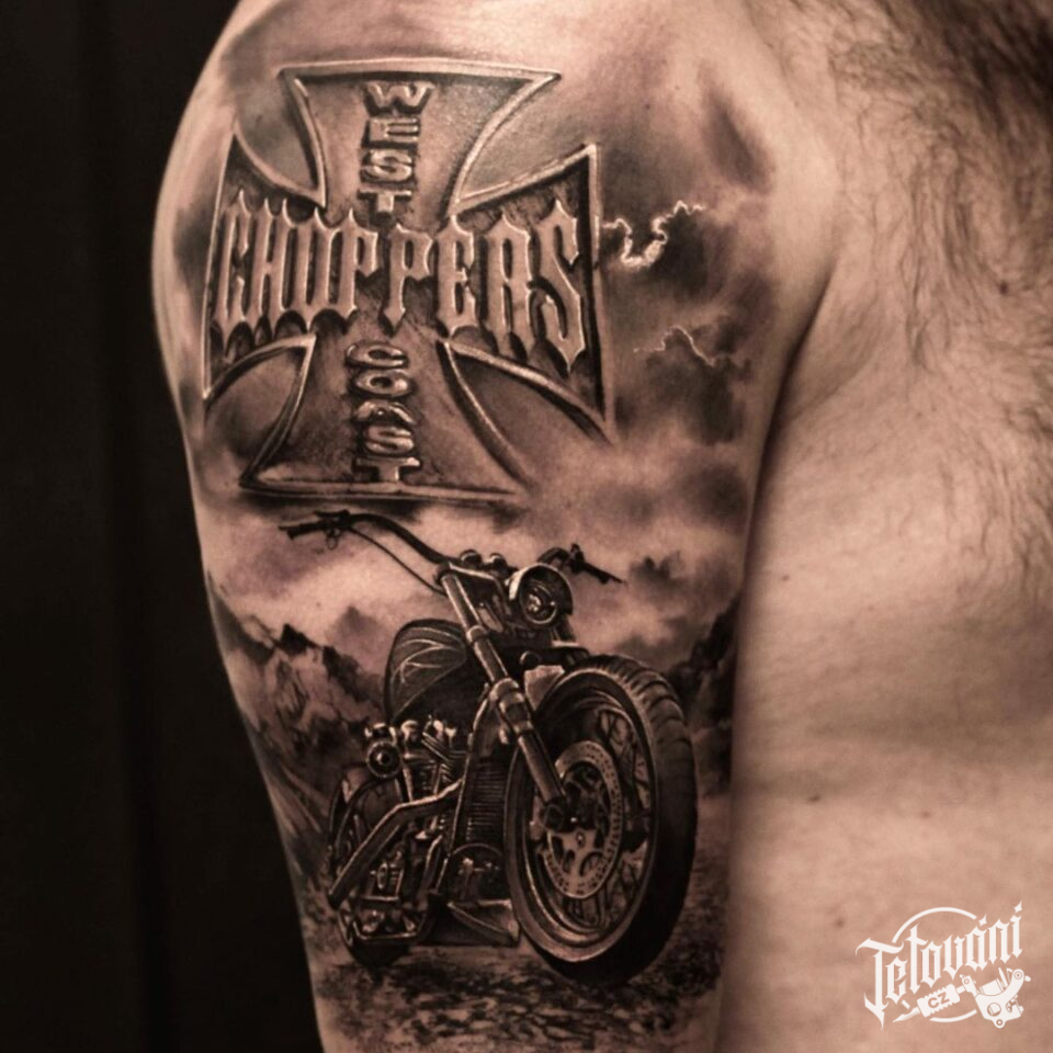Tetování dopravní prostředek, motorkáři, kříž s nápisem, příroda
