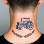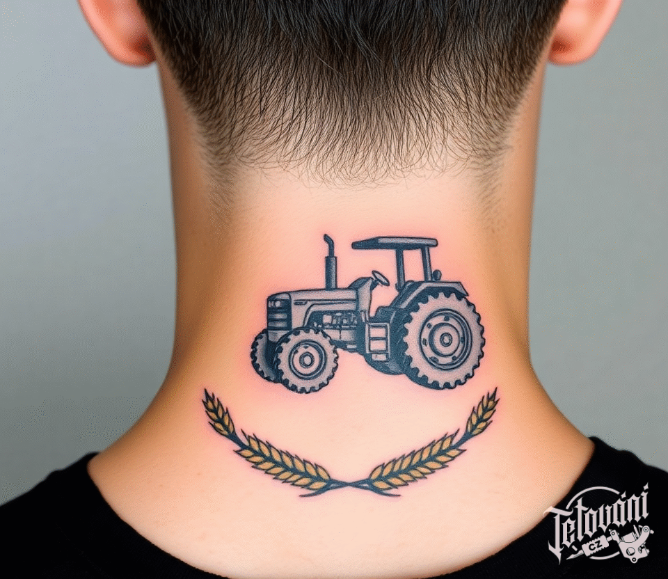 Tetování dopravní prostředek, traktor a květiny, obilí na krk
