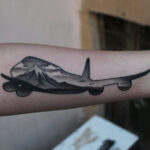 Tetování dopravní prostředky a příroda, hory a letadlo na předloktí