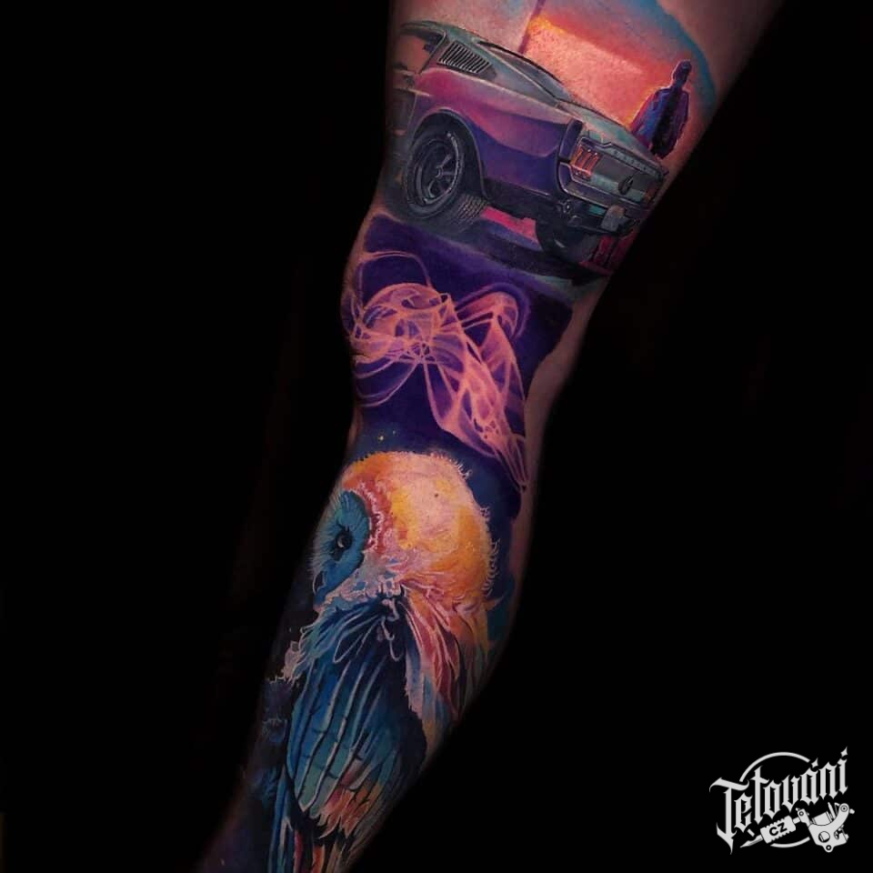 Tetování dopravní prostředky a zvíře, pták, auto, sova na noze