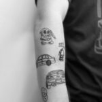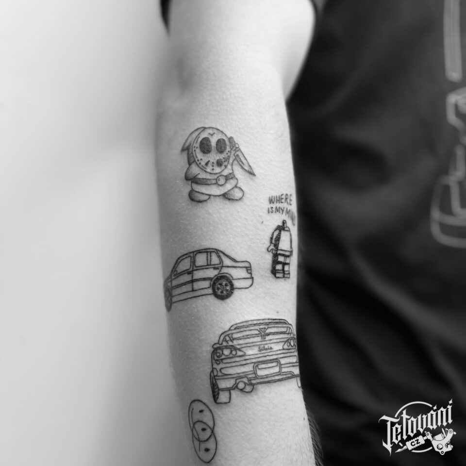 Tetování dopravní prostředky, auta a postavičky na předloktí