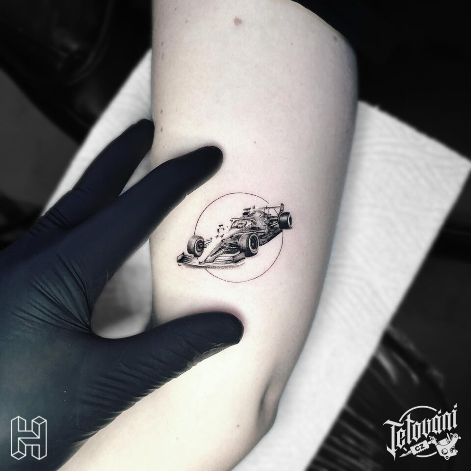 Tetování dopravní prostředky, auto formule na paži