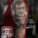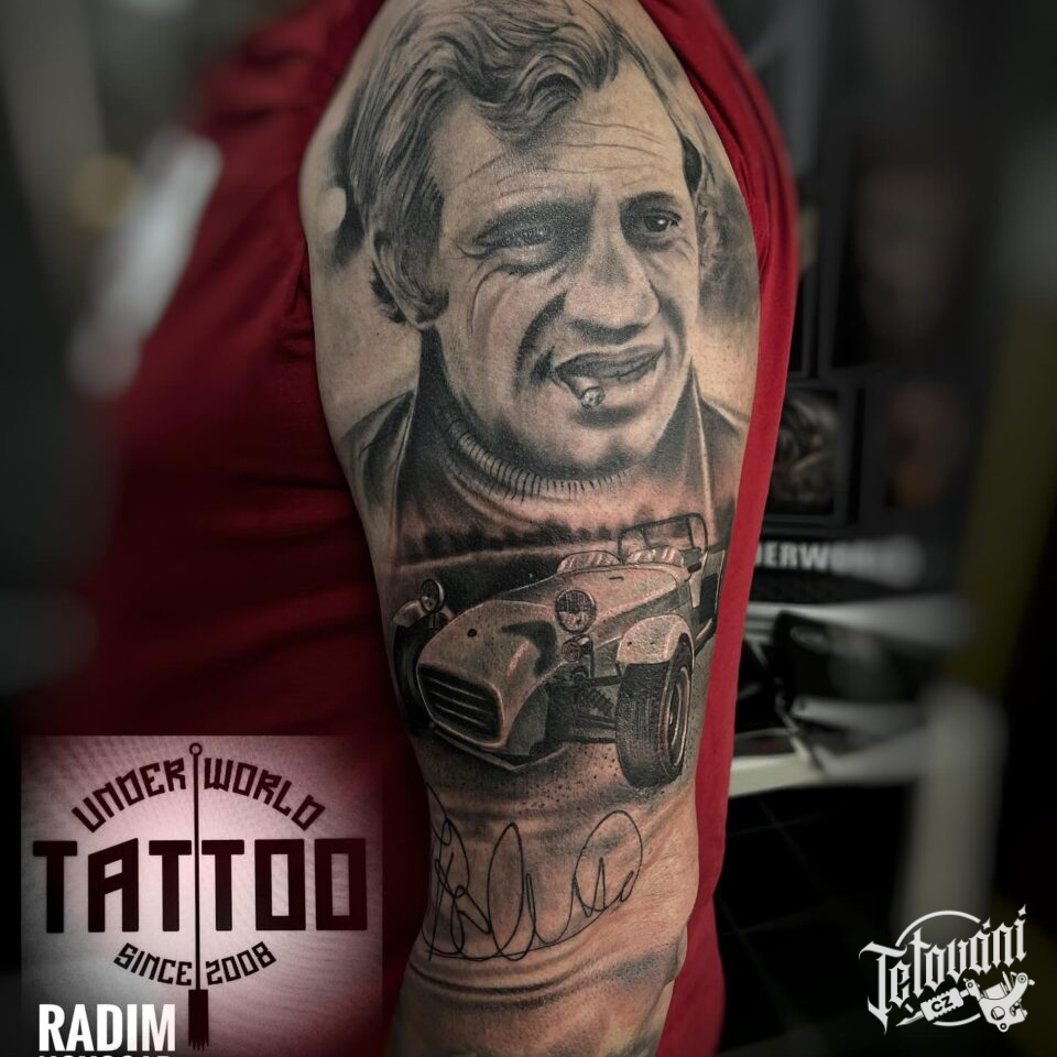 Tetování dopravní prostředky, auto, osobnosti, portrét Belmonda na paži