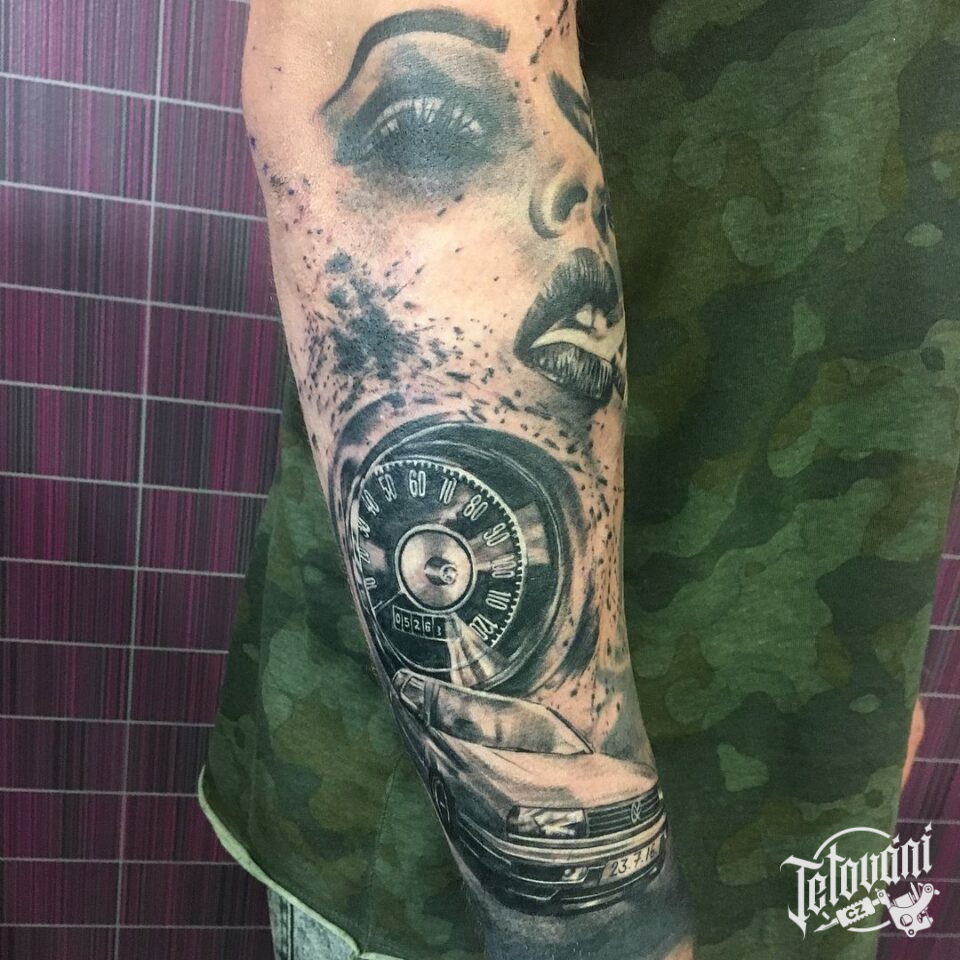 Tetování dopravní prostředky, auto, portrét na předloktí