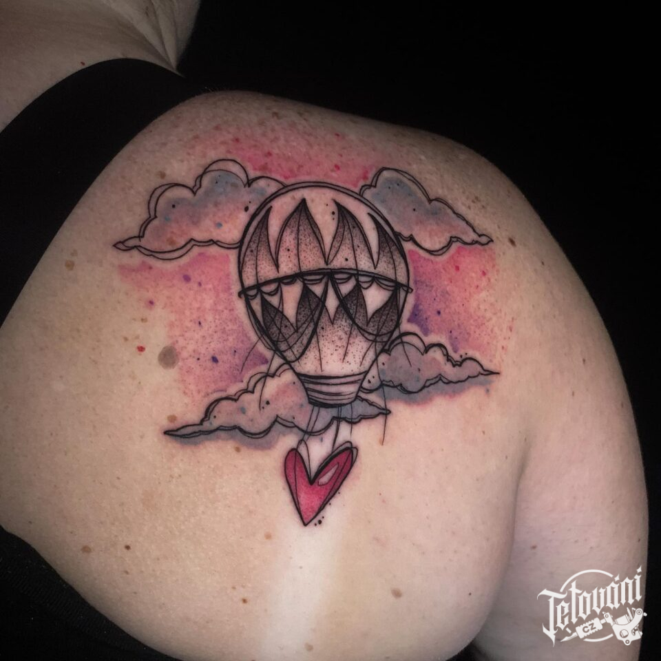 Tetování dopravní prostředky, horkovzdušný balon a srdce na lopatce