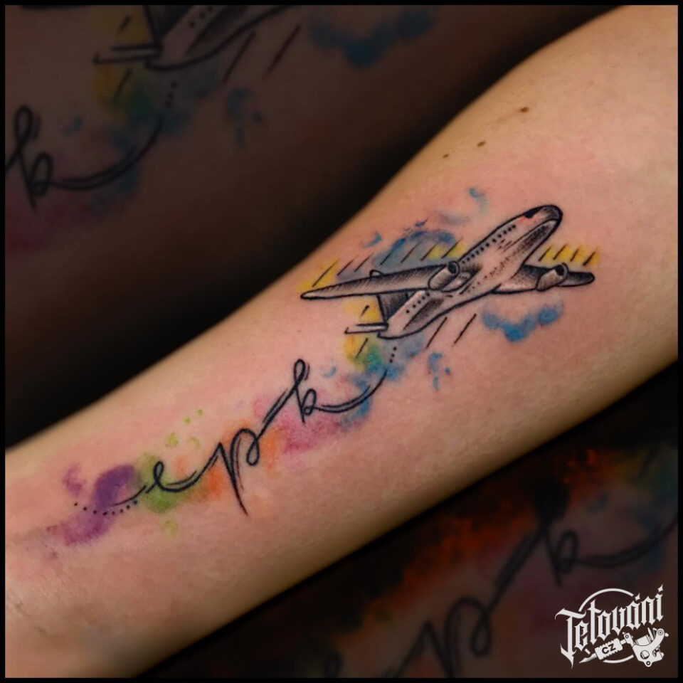 Tetování dopravní prostředky, letadlo a nápisy, písmena na předloktí
