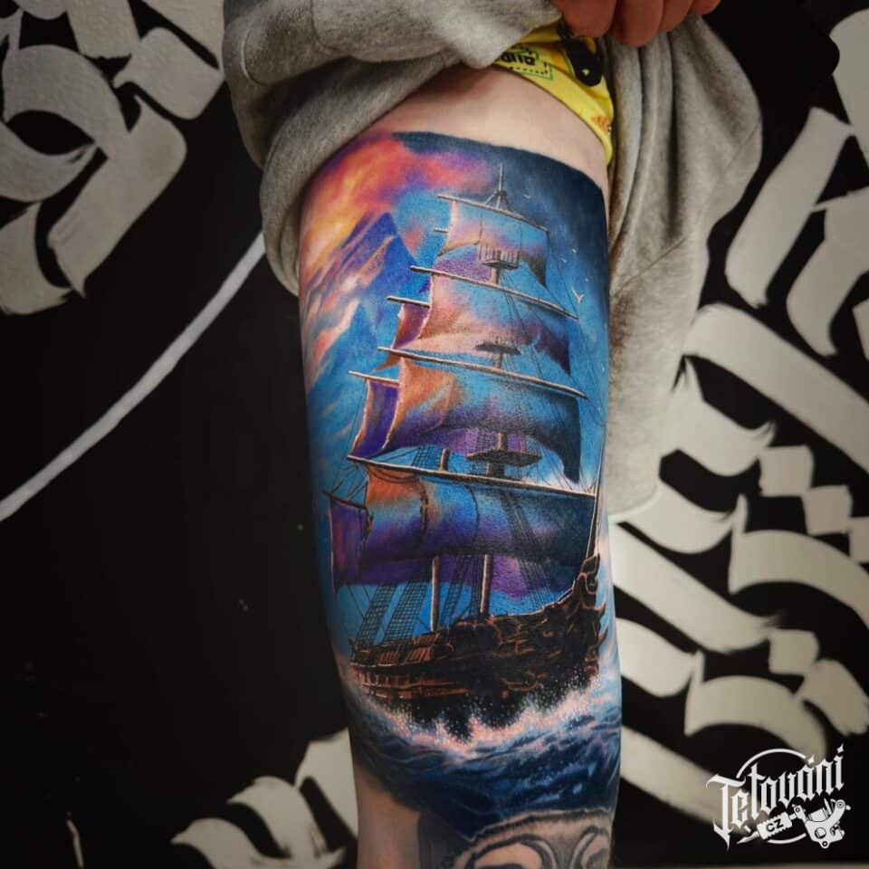 Tetování dopravní prostředky, loď na stehně