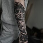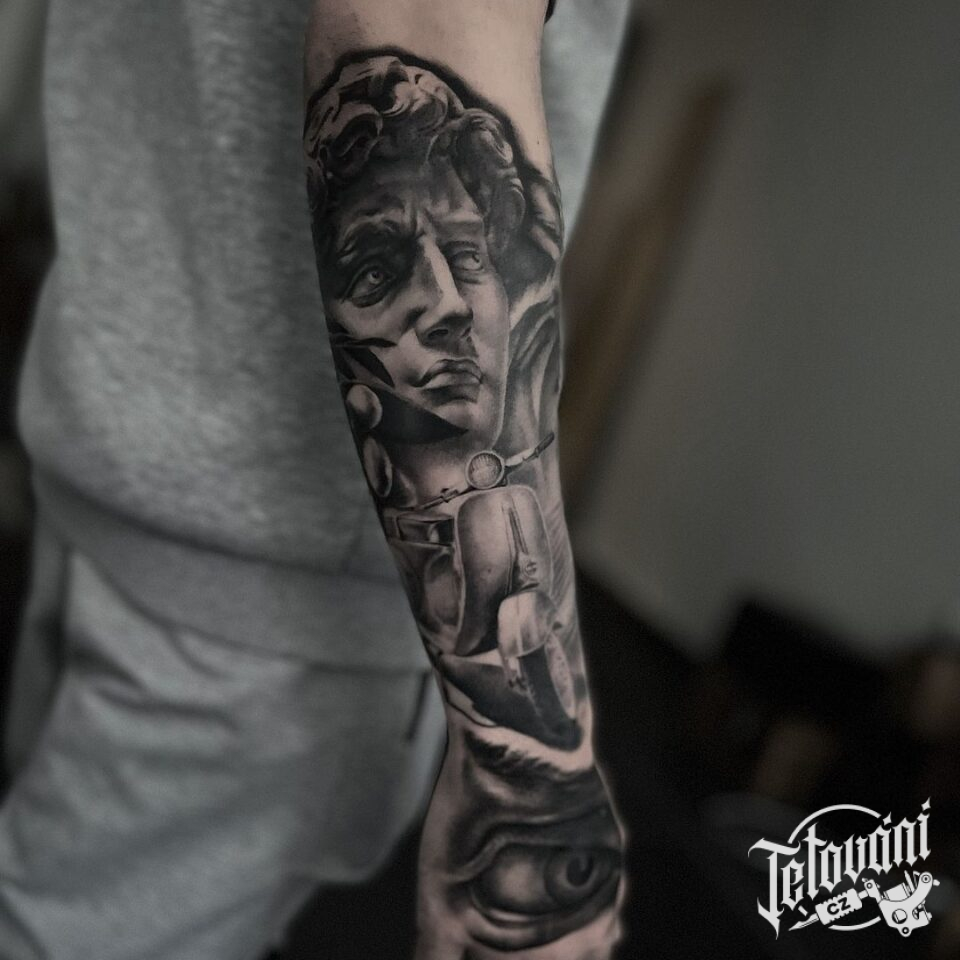 Tetování dopravní prostředky motorka, portrét a oko na předloktí