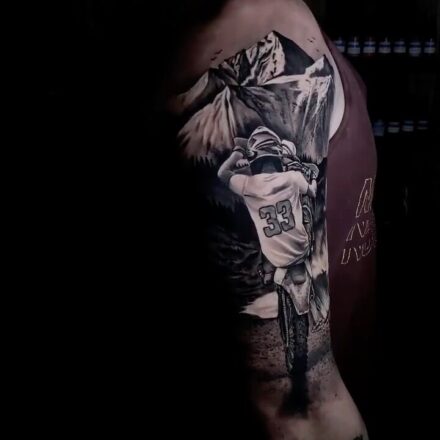 Tetování dopravní prostředky motorkář a příroda na paži