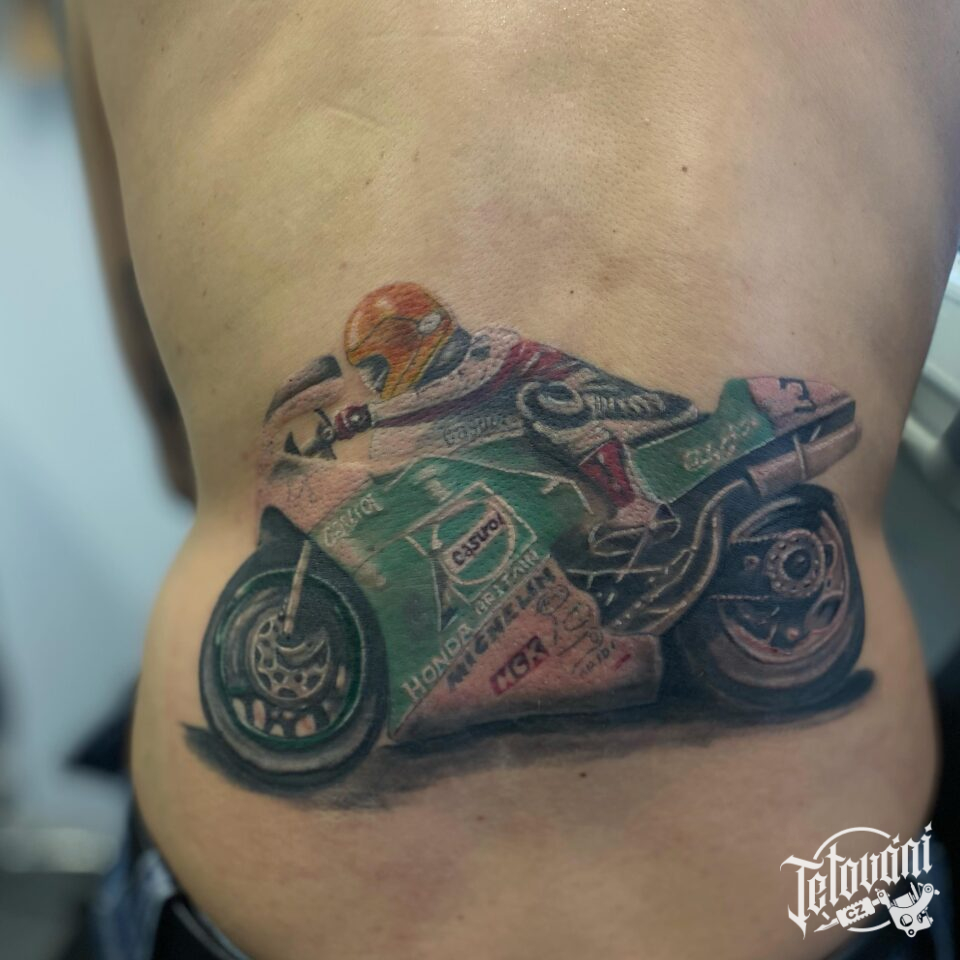 Tetování dopravní prostředky, motorkář na zádech