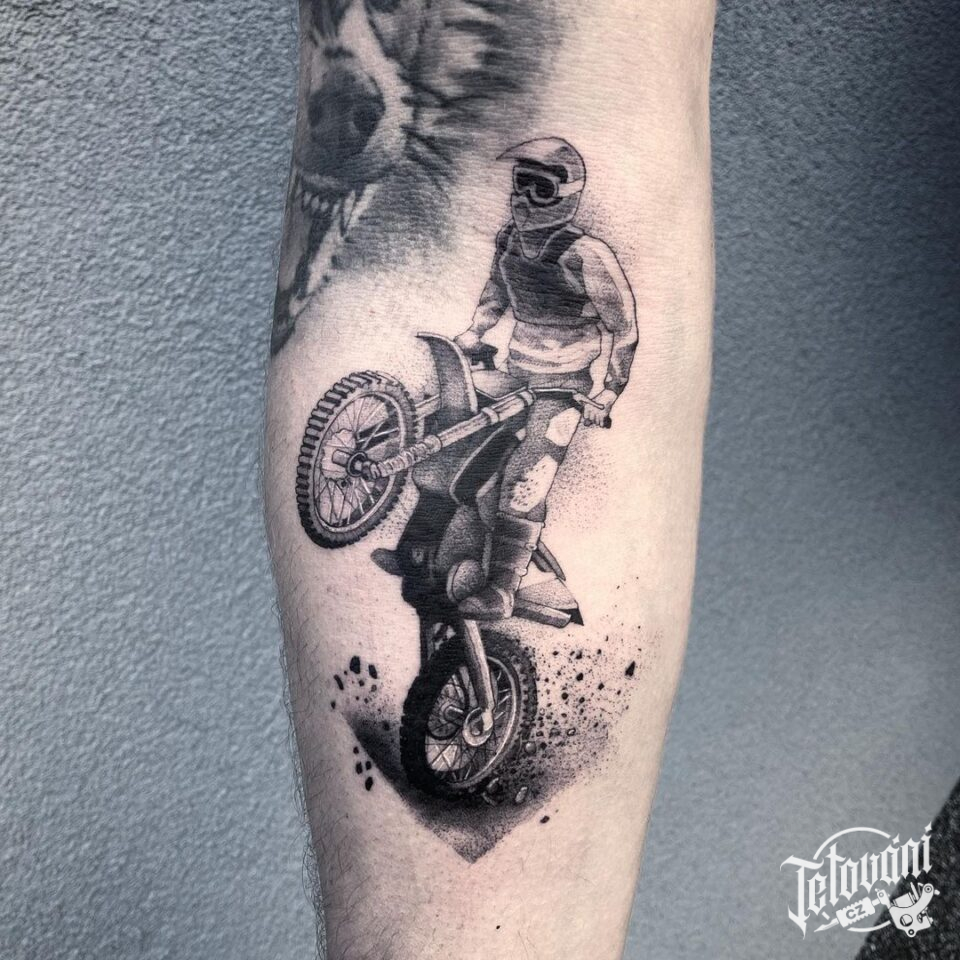 Tetování dopravní prostředky, motorkář, znaky a symbol na lýtko