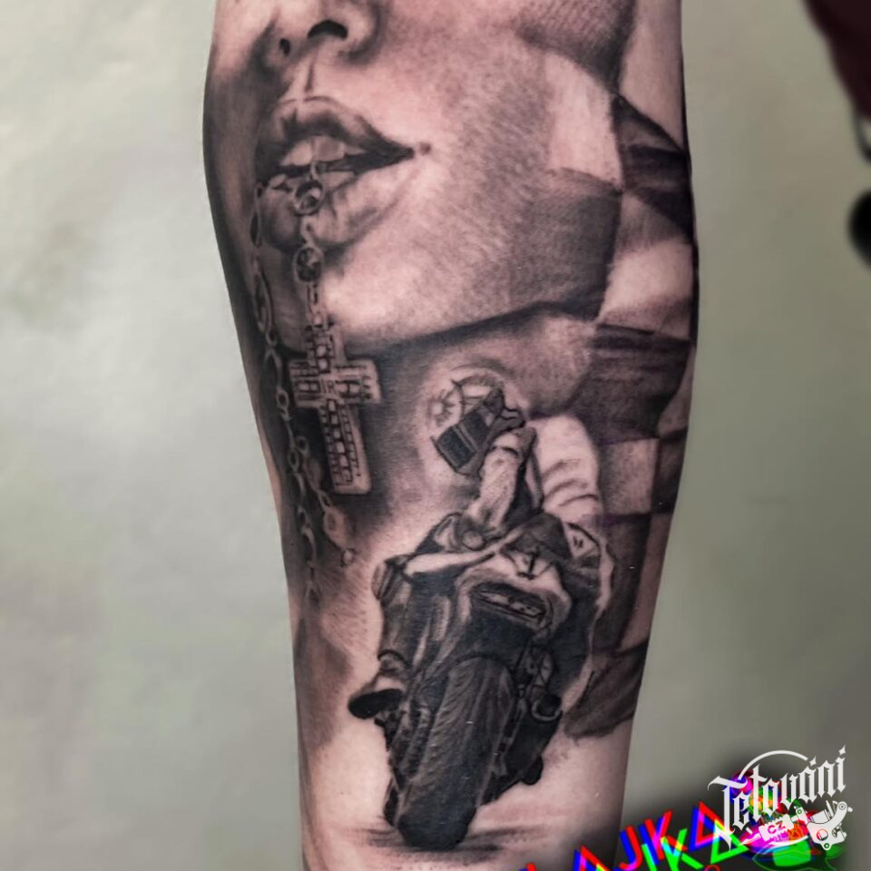 Tetování dopravní prostředky, motorkáři a růženec na předloktí