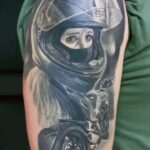 Tetování dopravní prostředky, portrét motorkářky, motorka na rameni