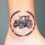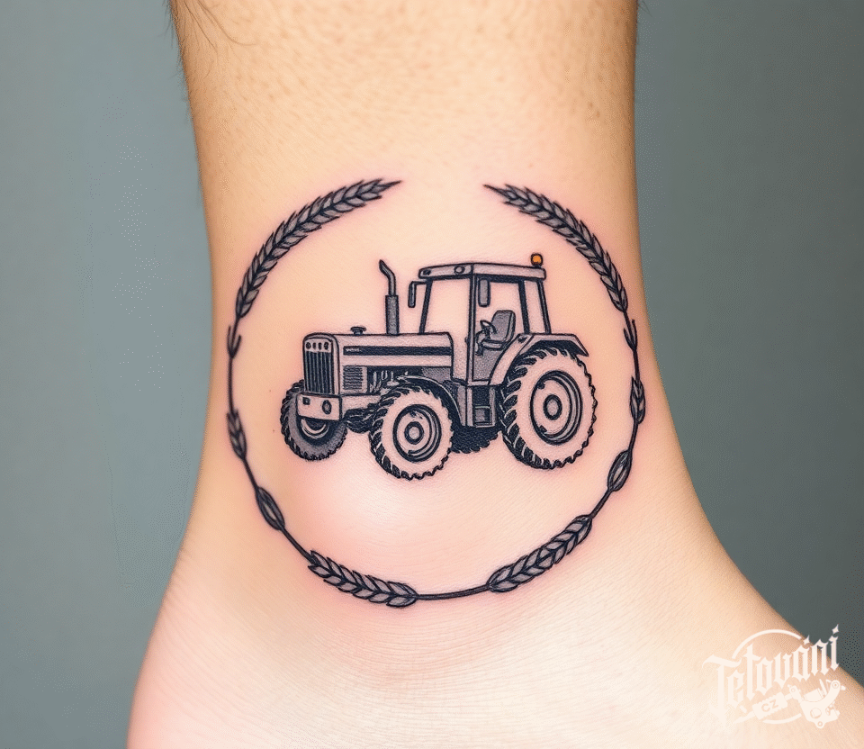 Tetování dopravní prostředky, traktor a květiny na kotník