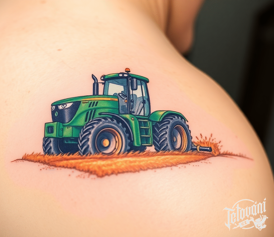 Tetování dopravní prostředky, traktor na poli v přírodě na záda