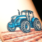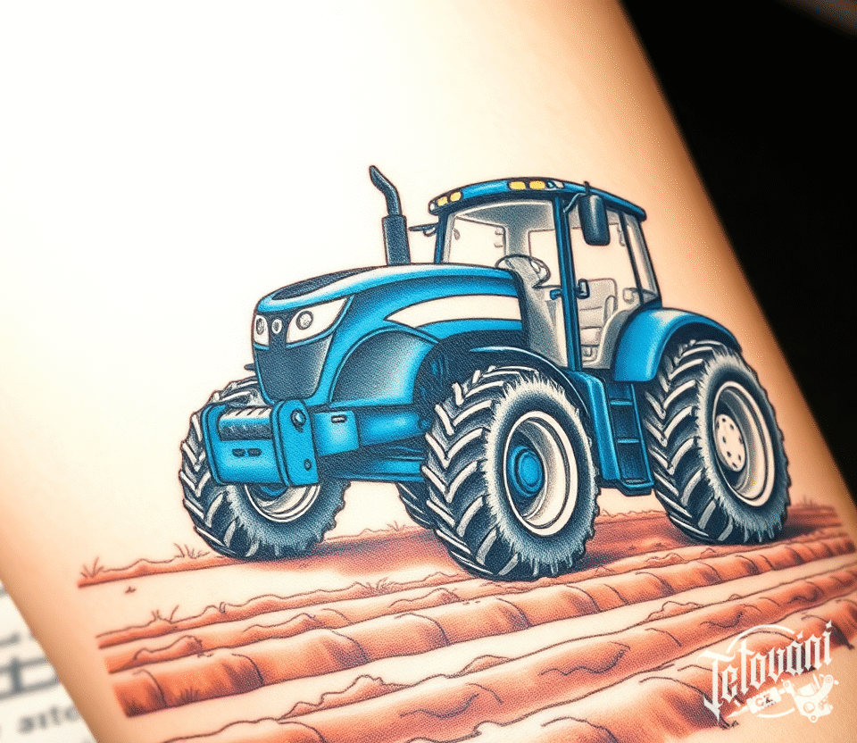 Tetování dopravní prostředky, traktor v přírodě na poli na předloktí
