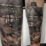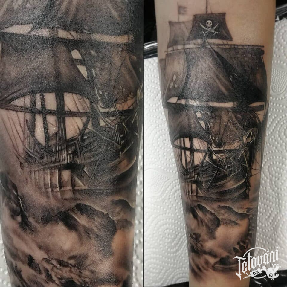 Tetování dopravní prostředky z filmů a pohádek, pirátská loď a moře na předloktí