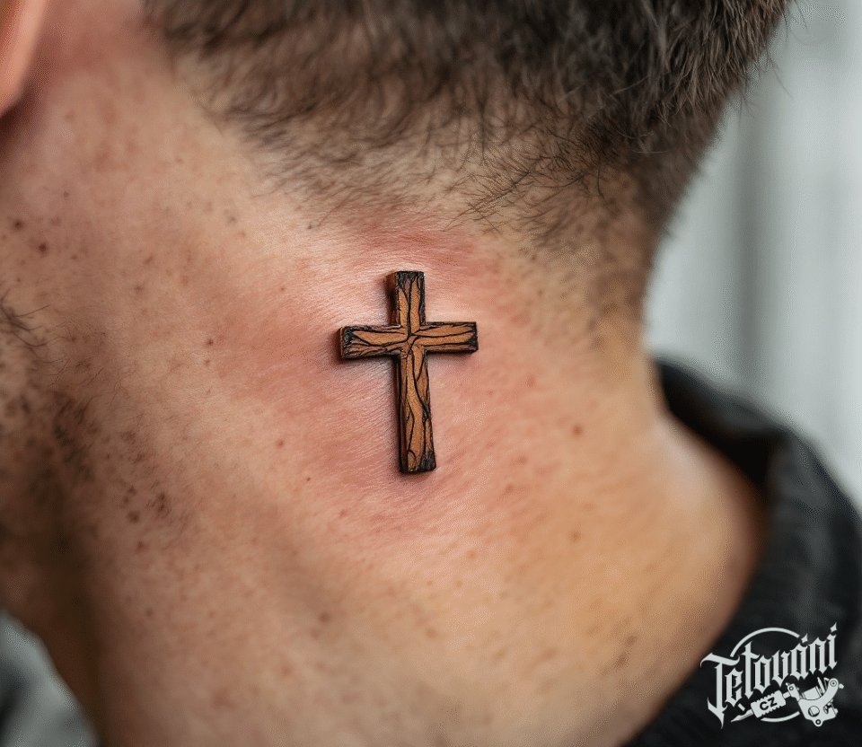 Tetování dřevěný křížek na krku