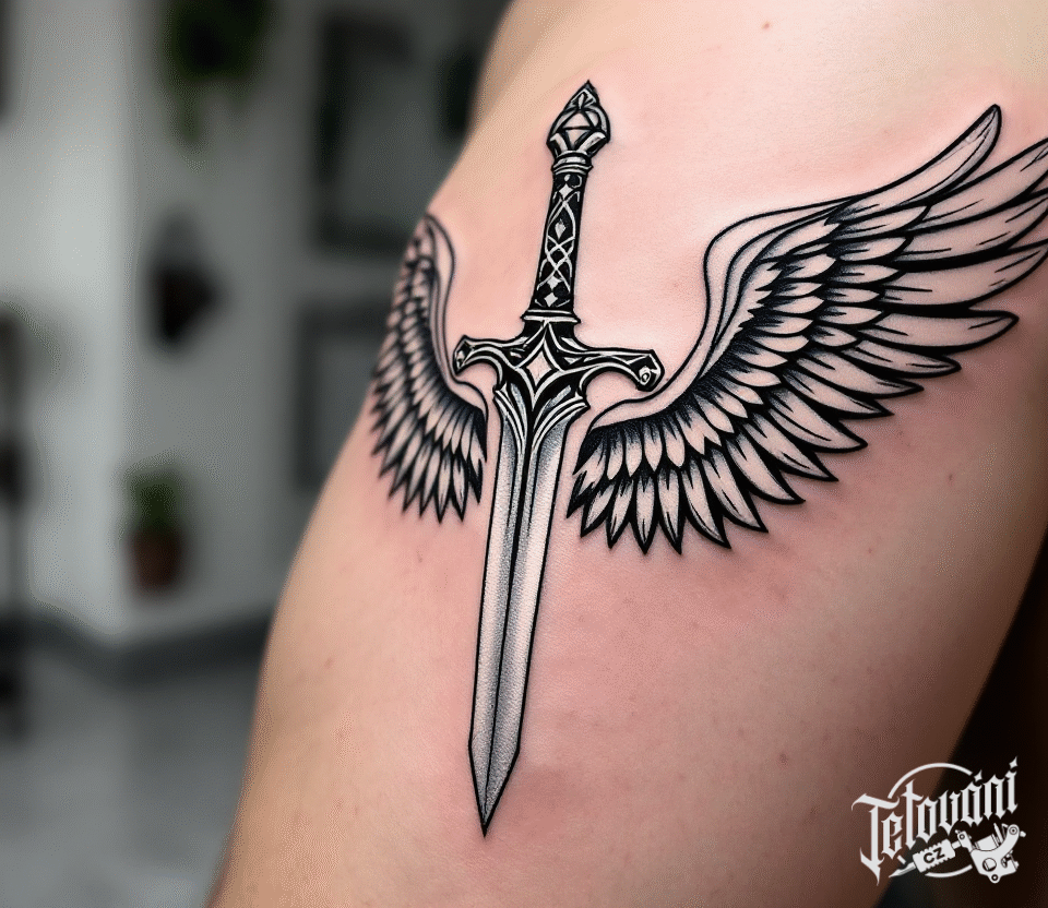 Tetování dýka s andělskými křídly na rameni