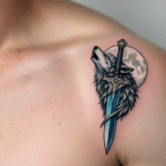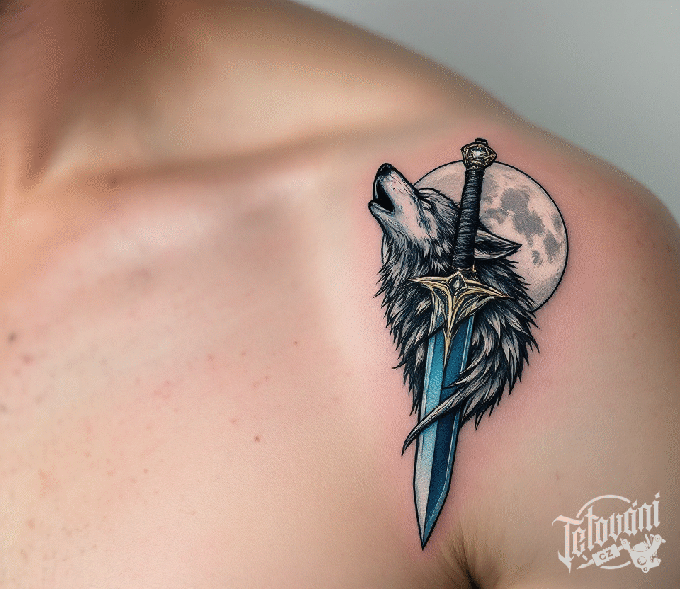 Tetování dýka, vlk a měsíc na rameni