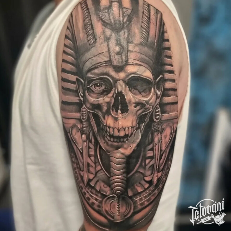 Tetování egyptská mytologie, lebka Tutanchamona, mýtická bytost na rameno