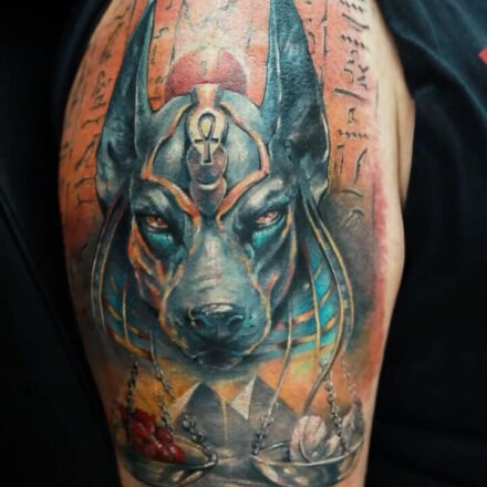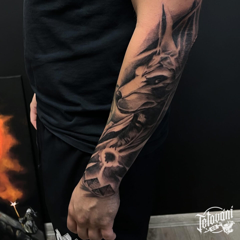 Tetování egyptská mytologie, mýtická bytost Anubis na předloktí