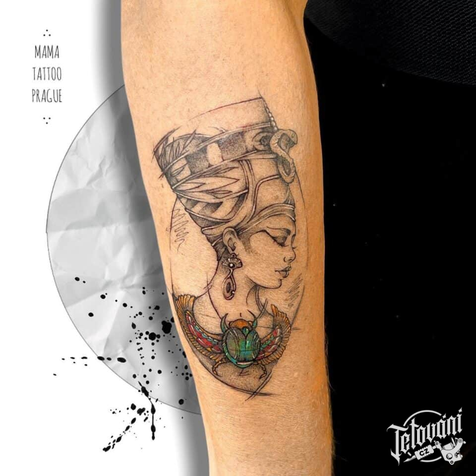 Tetování egyptská mytologie, portrét nefertiti na předloktí