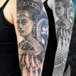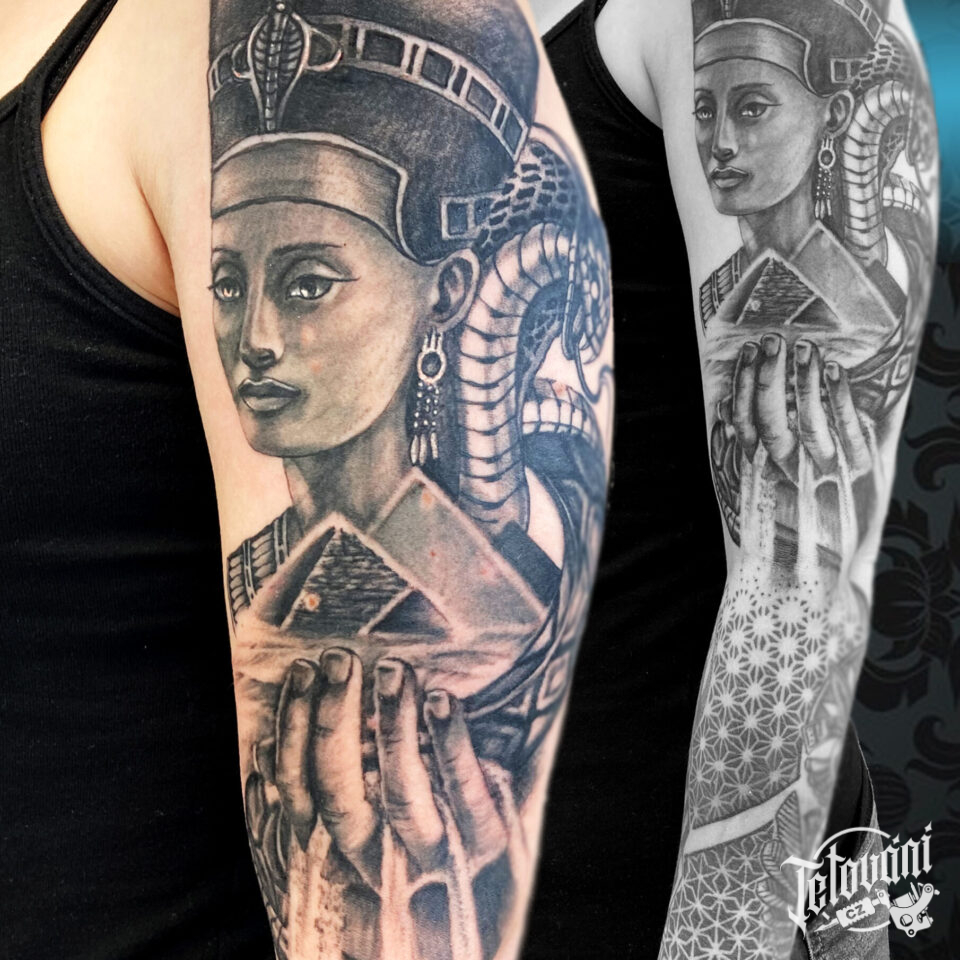Tetování egyptská mytologie, portrét, ruka, ornamenty, rukáv