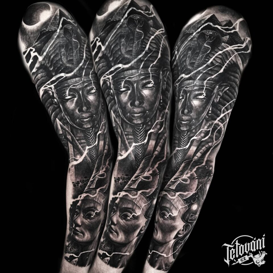 Tetování egyptské masky na rukávu