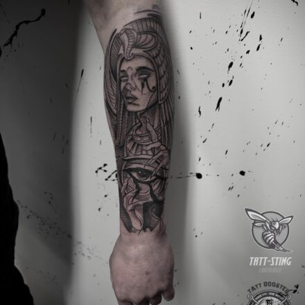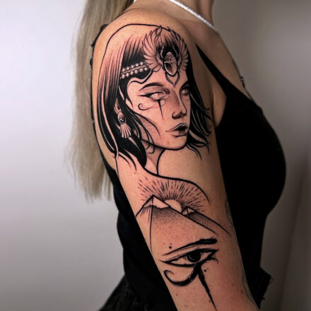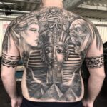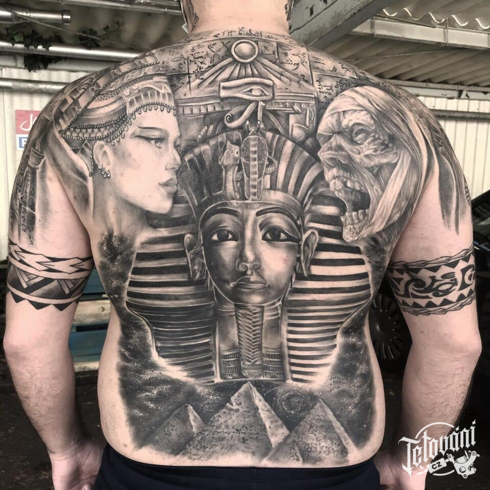 Tetování egyptské oko a portréty, tutanchamon, pyramidy a mumie na zádech
