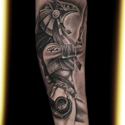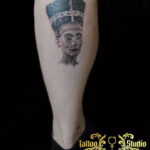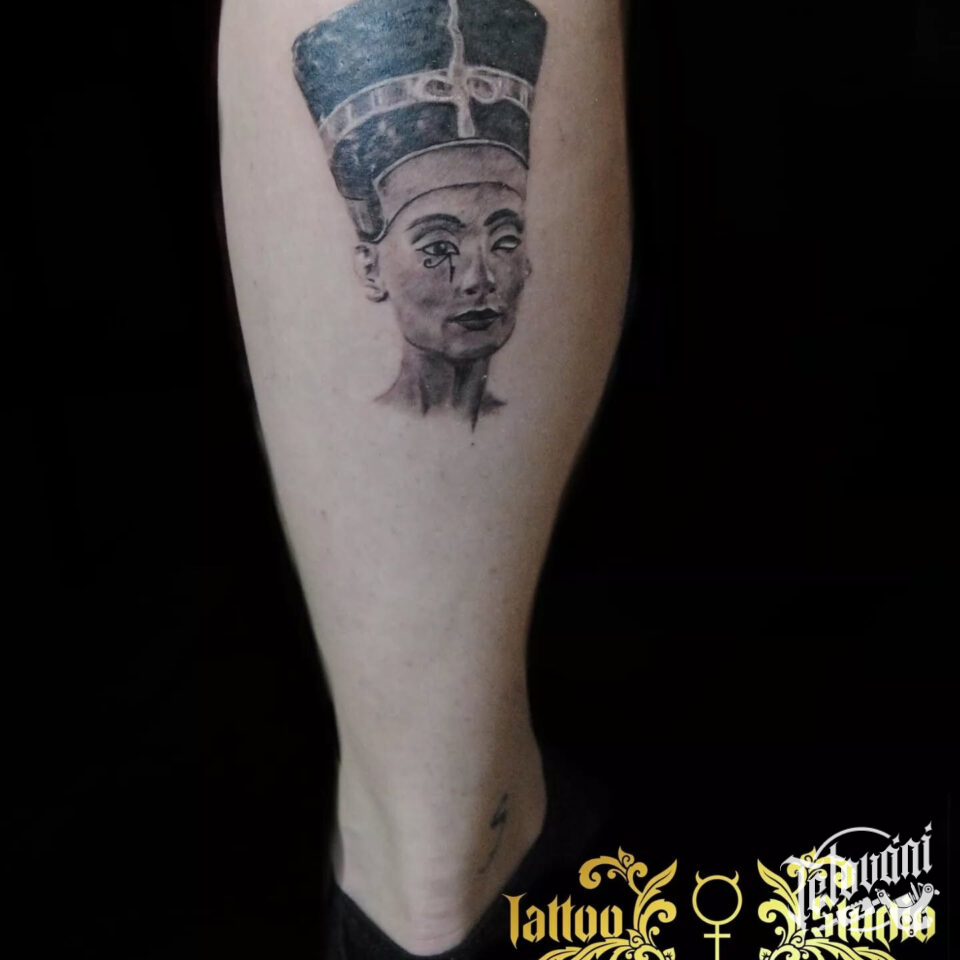 Tetování egyptské symboly, osobnosti, portrét Nefertiti na lýtku