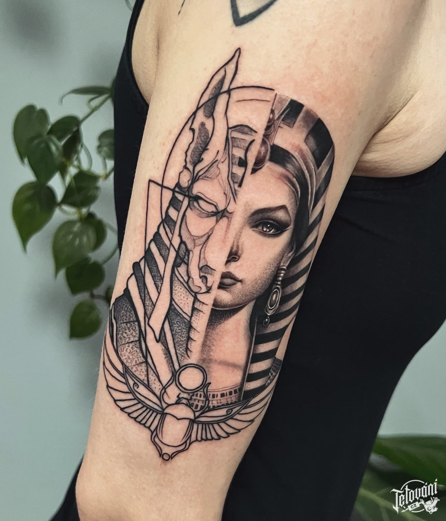 Tetování egyptské symboly, portréty, mýtická bytost, Anubis na předloktí