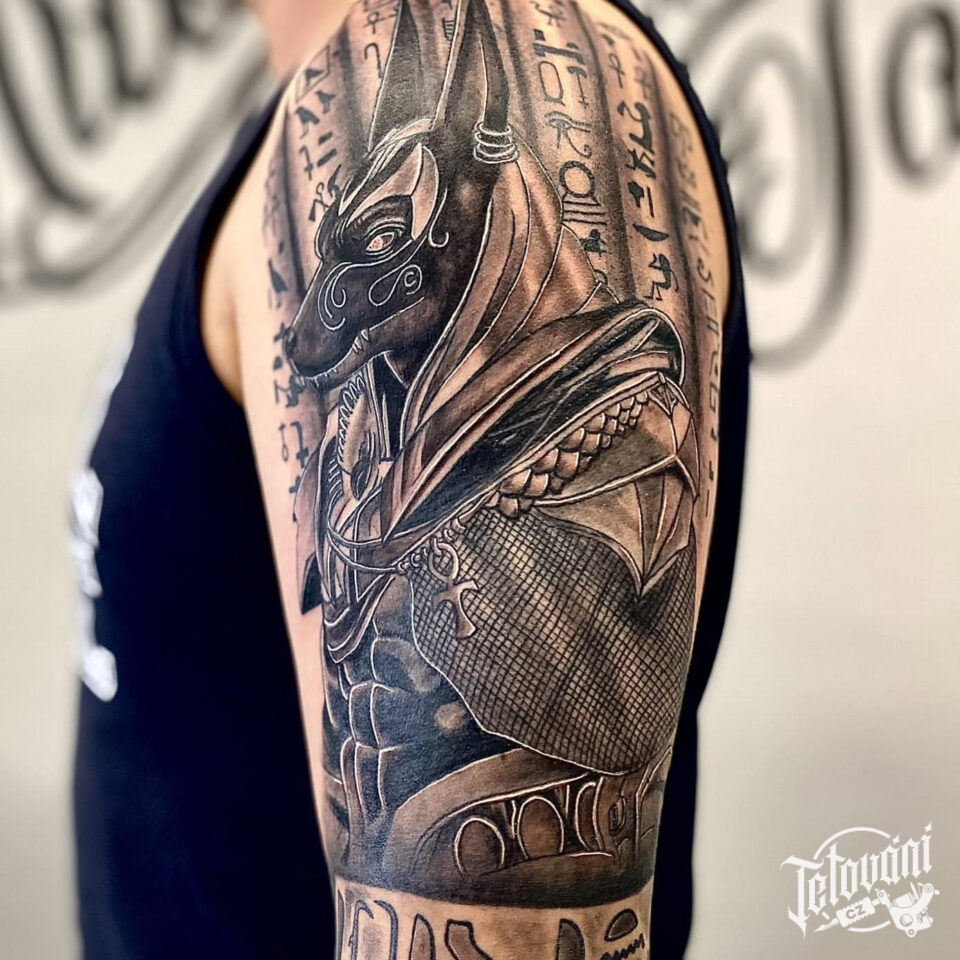 Tetování egyptské znaky, mýtická bytost, Anubis na rameni