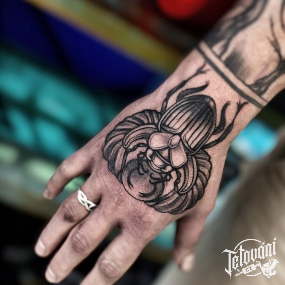 Tetování egyptský symbol, zvíře brouk Skarabeus na hřbet ruky