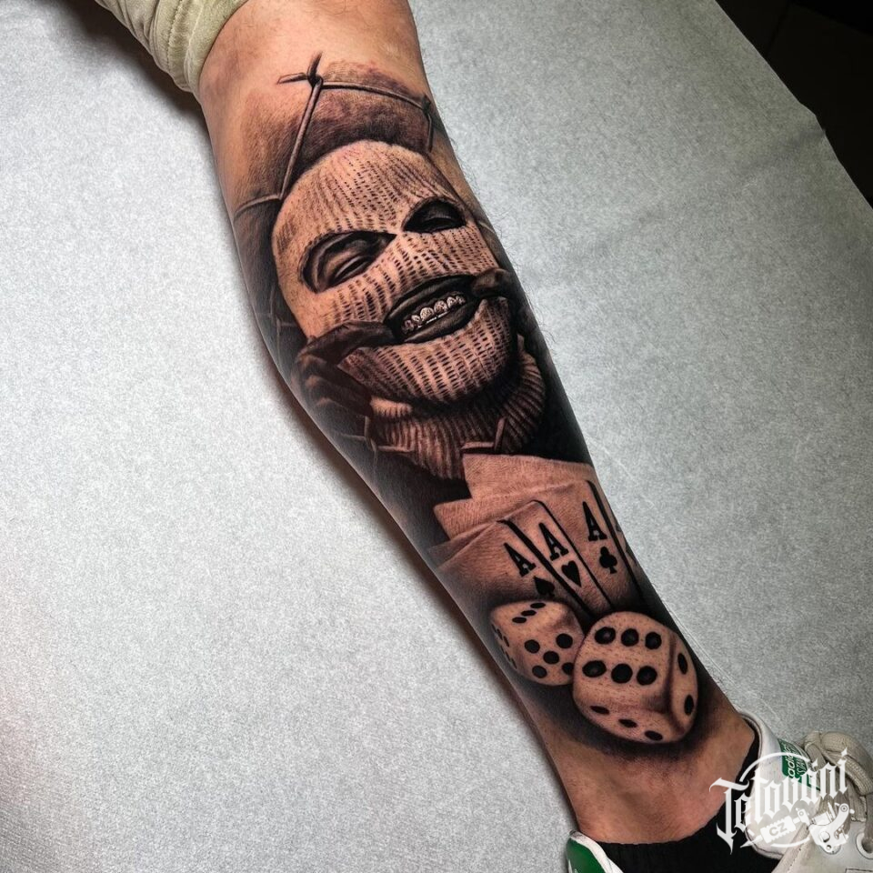 Tetování esa, hrací kostky a karty, portrét na lýtku
