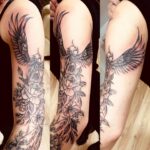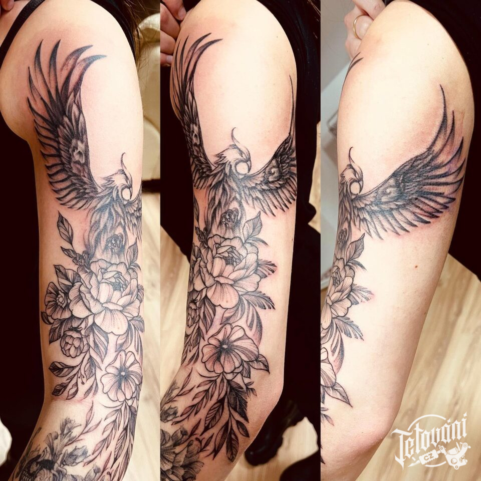 Tetování fénix, mýtická bytost, květiny, růže na rameno