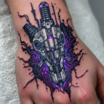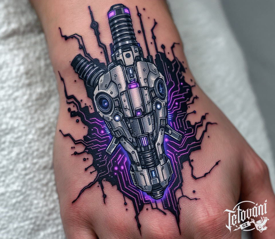 Tetování fialová robotická ruka, hřbet ruky